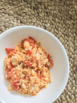Stir fried tomato and egg is super simple side dish to add to your repertoire of Chinese cuisine. What’s funny is that I never see this on “Chinese” takeout menus, even though it’s so easy to make. When I lived in China, I ate tomato and egg all the time! Include it as a side dish for a family meal or eat it over rice on its own.