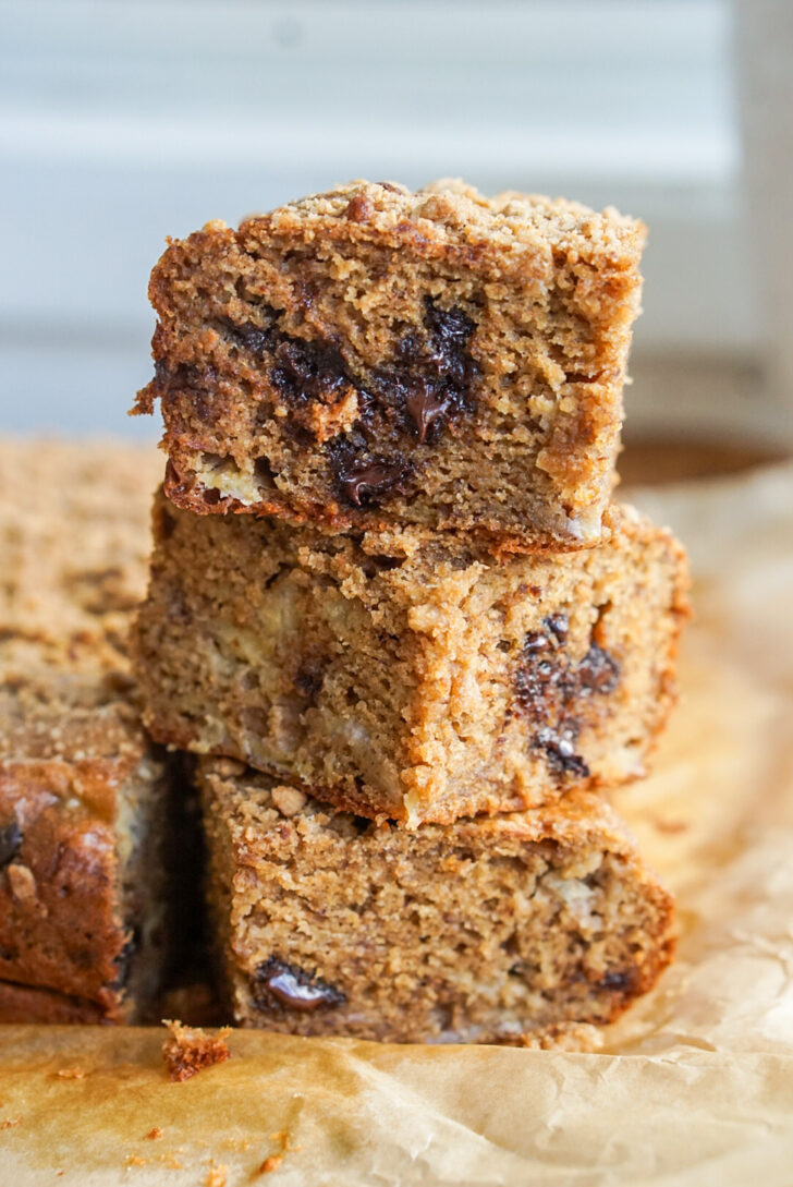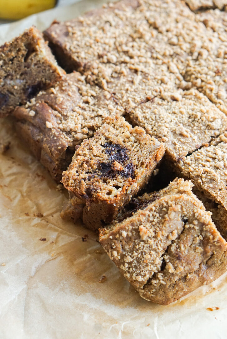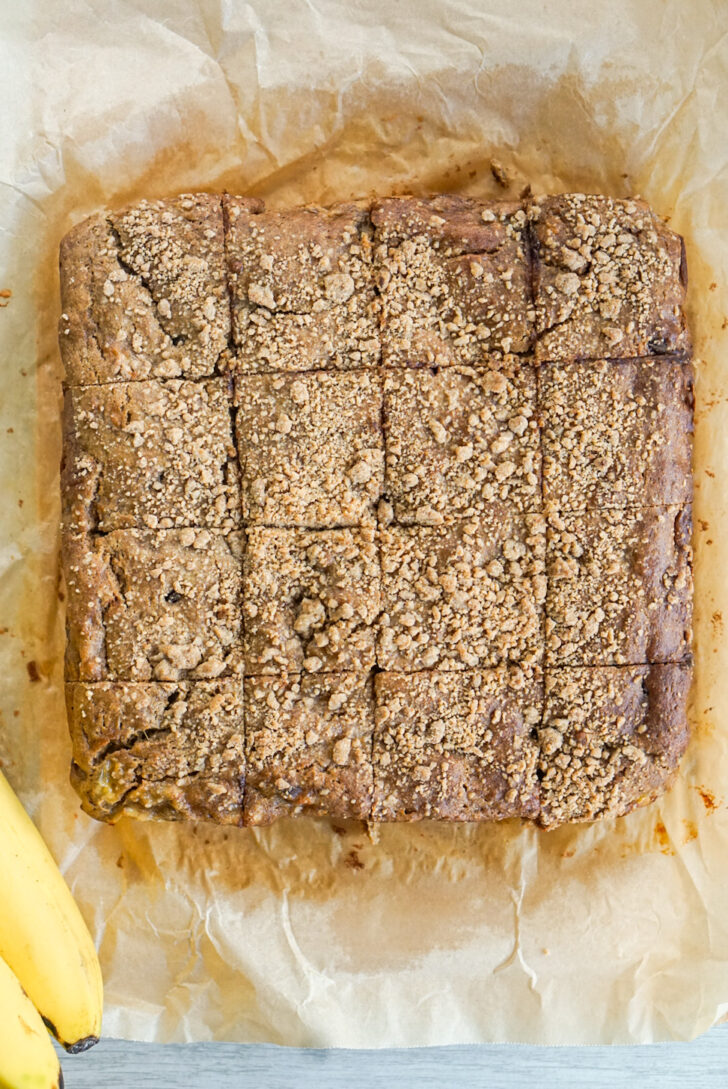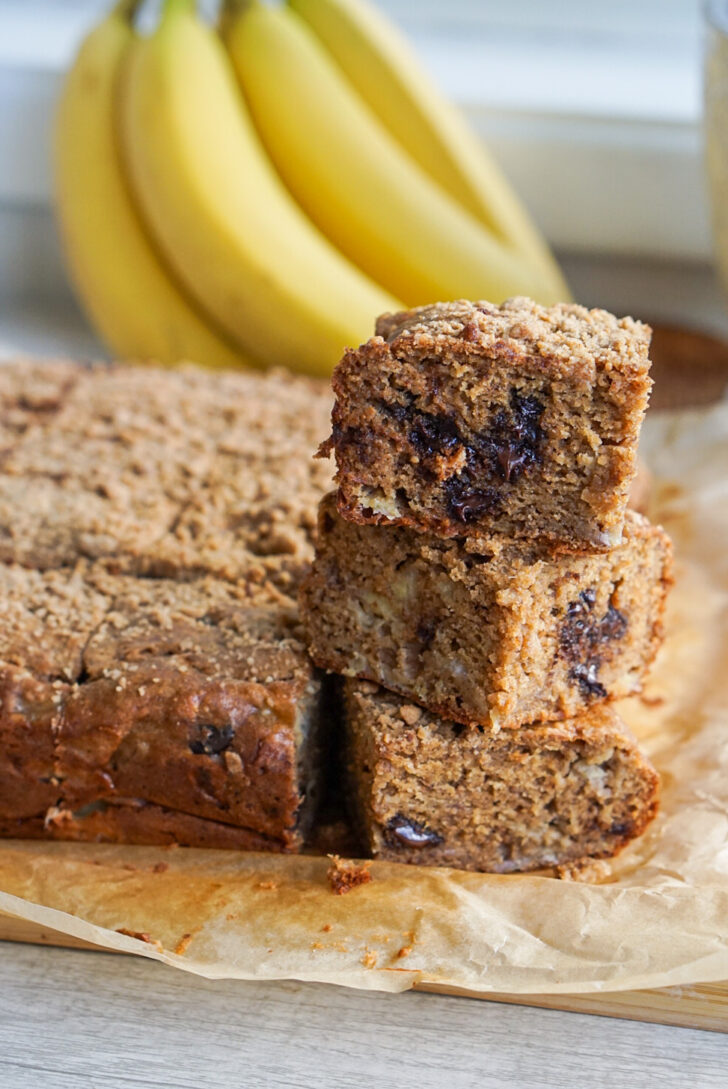 I like baking banana bread in a 9×9″ square metal pan because it bakes faster and is very easy to slice into equal portions. You can use a loaf pan instead, if you like that. The baking time will probably be around one hour if you choose to do so.