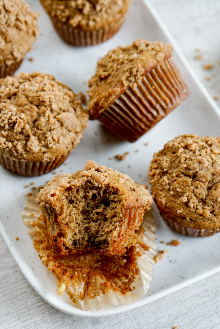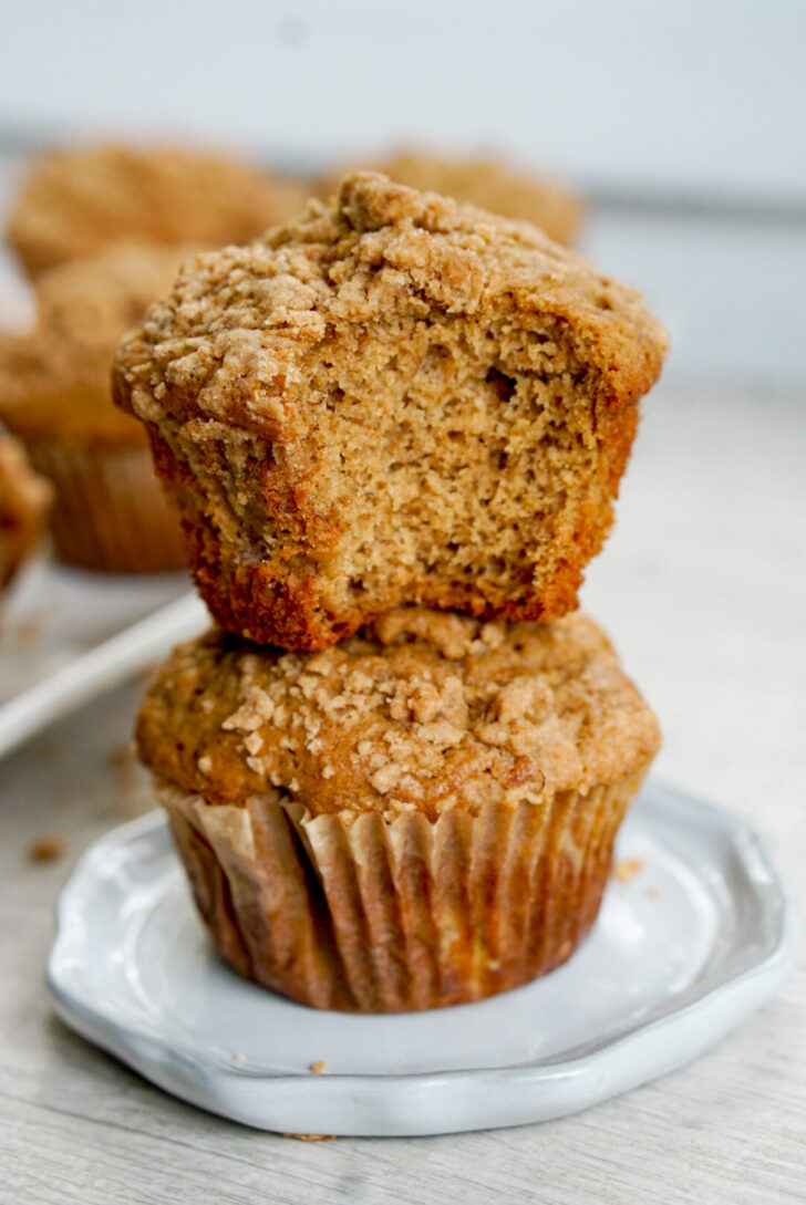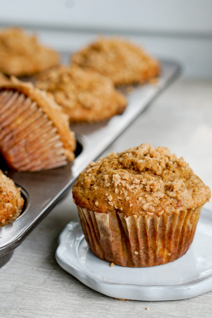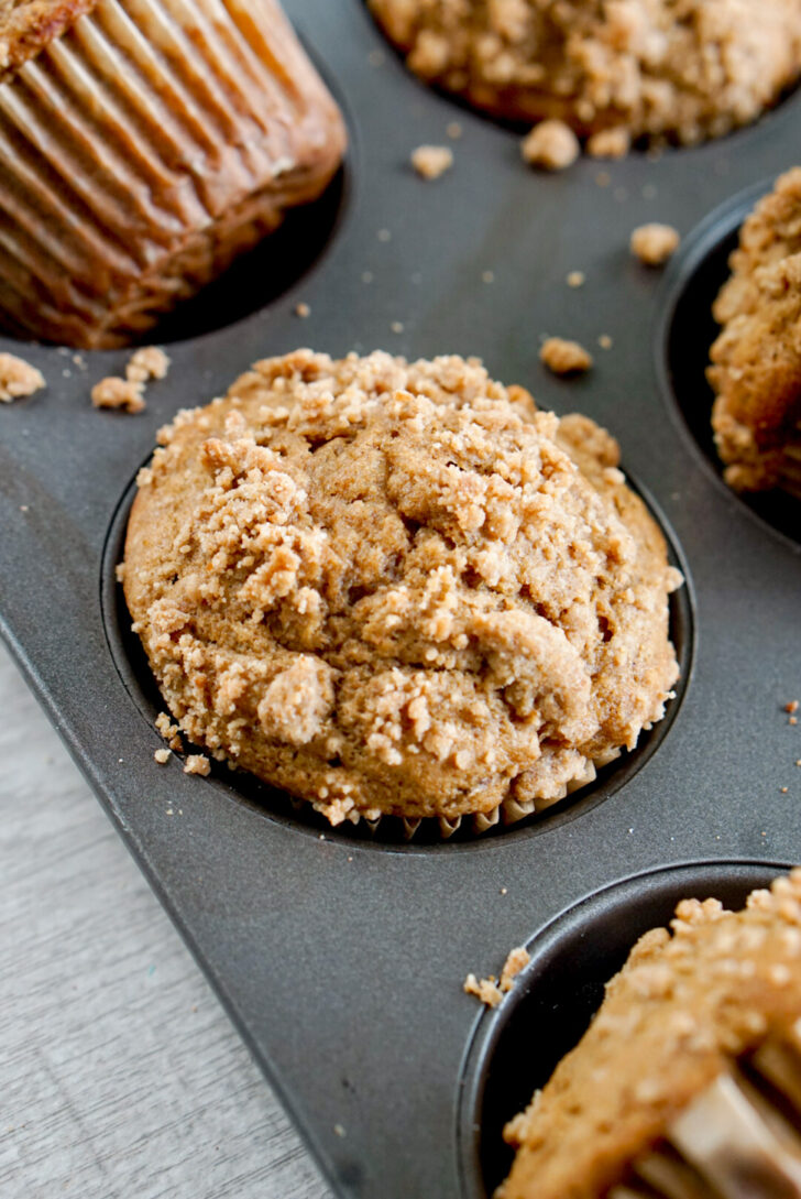 - Divide the batter into the 12 muffin liners. It should fill the cups all the way to the top. Sprinkle the streusel on top (you may have extra).