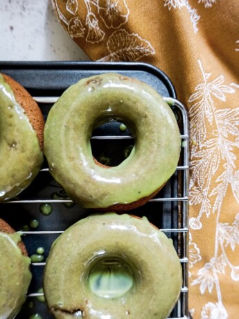 These baked mochi donuts with matcha white chocolate glaze are super easy to make. Kids can decorate with candy eyeballs for Halloween!