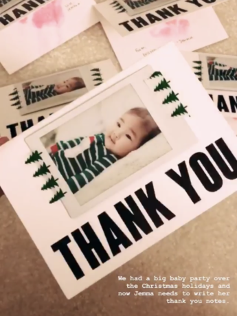 Use a Fujifilm printer and washi tape to attach photos from your phone to blank cards for a pretty custom thank you note!