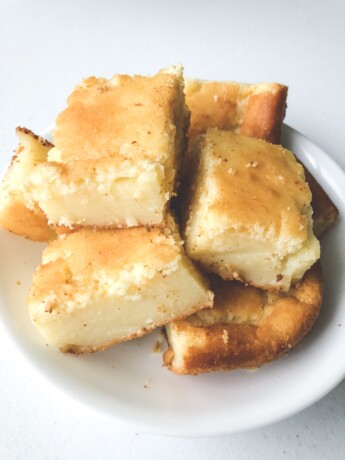 Custard mochi is a Hawaiian dessert that's super easy to throw together. It's chewy, dense, creamy, and gluten free!