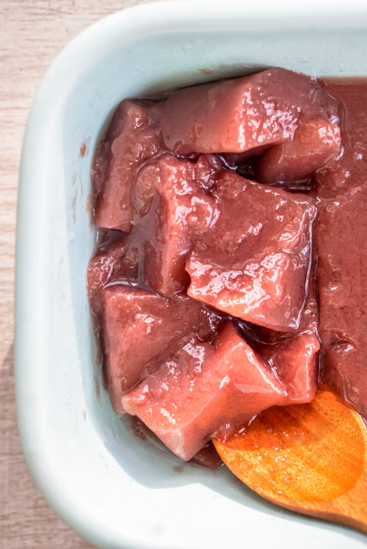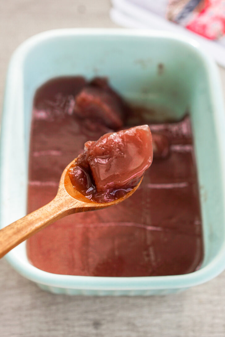My recipe down below has instructions for gelatin powder, since it’s my preference, but it’s very easy to substitute kanten instead. Use 1/2 tsp of kanten powder in place of the packet of gelatin, which is about 1g. Heat 1/2 cup of water in a pot on the stovetop until boiling. Add the kanten and boil for 2 minutes. Turn off the heat and mix in the red bean paste. Then add the 1/2 cup of ice cold water and mix. Pour into your mold and chill in the refrigerator for about an hour or until set. While gelatin just needs to be put in hot water enough to dissolve, kanten needs to be boiled, so don’t skip that step.