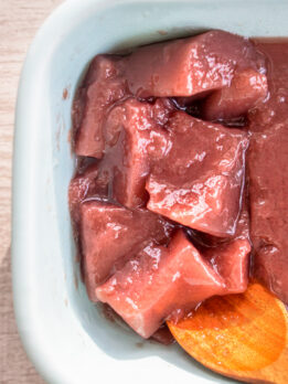 Japanese red bean paste is made with azuki beans, and there are several types of pastes with differ in texture, sort of similar to how you can get creamy or crunchy peanut butter. For a smooth jelly, use koshi an, which is a smooth texture red bean paste. If you don’t mind some partial bean chunks, you can use tsubu an, which has a chunky texture. Another way to add some texture to this dessert is to add chopped chestnuts, which is known as kuri yokan in Japanese. The only risk when doing tsubu an or adding chestnuts is that they may sink to the bottom of the jelly.